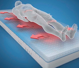 Cuenta con un núcleo de espuma monolítico. La superficie superior del colchón presenta un perfil transversal y longitudinal distribuido de modo uniforme sobre toda su superficie. Gracias a este perfil, se produce una mejor circulación del aire entre la piel del paciente y la base. También ayuda a distribuir la presión de un modo óptimo, el colchón garantiza un mayor confort y una mejor distribución de la presión entre el paciente y el colchón, ayuda a reducir la transpiración de un paciente y también la humedad de la piel.